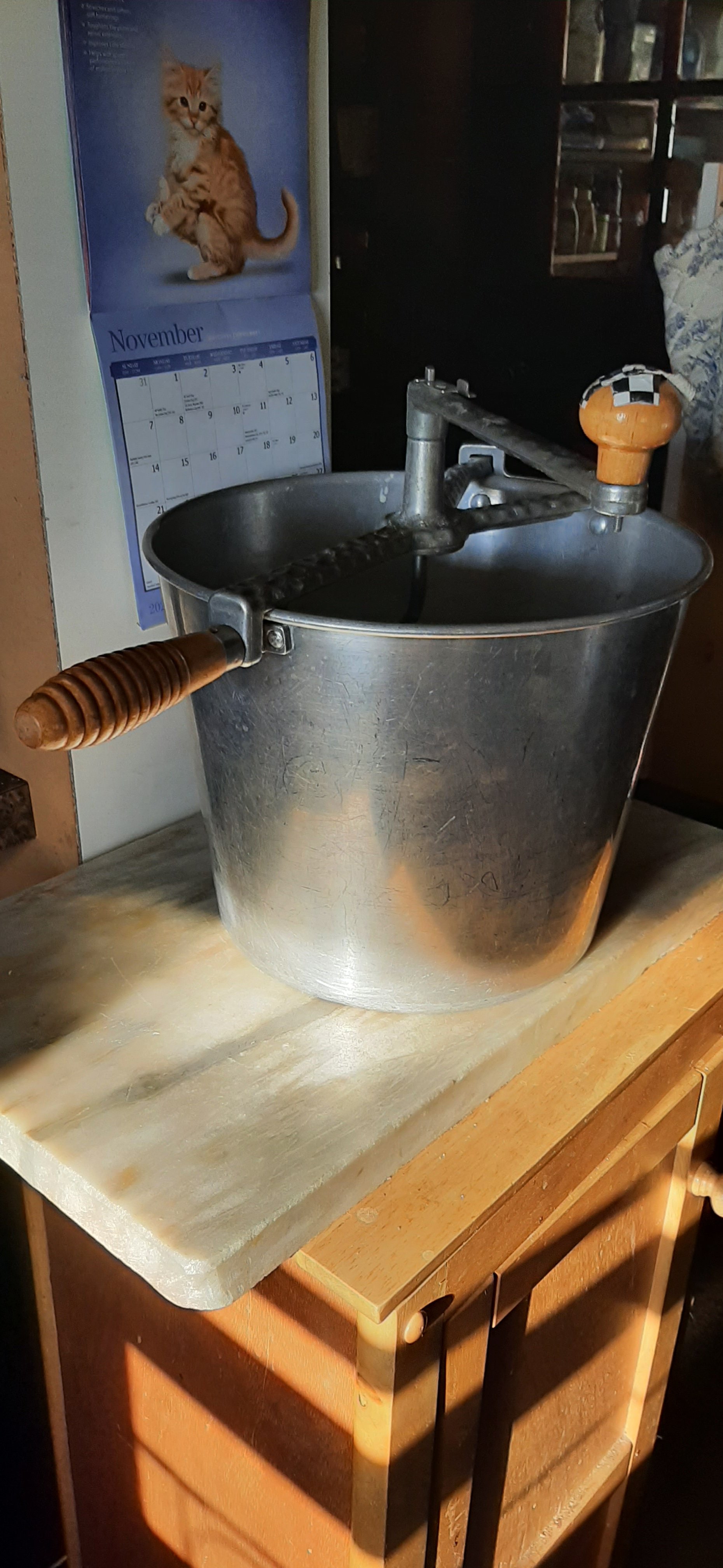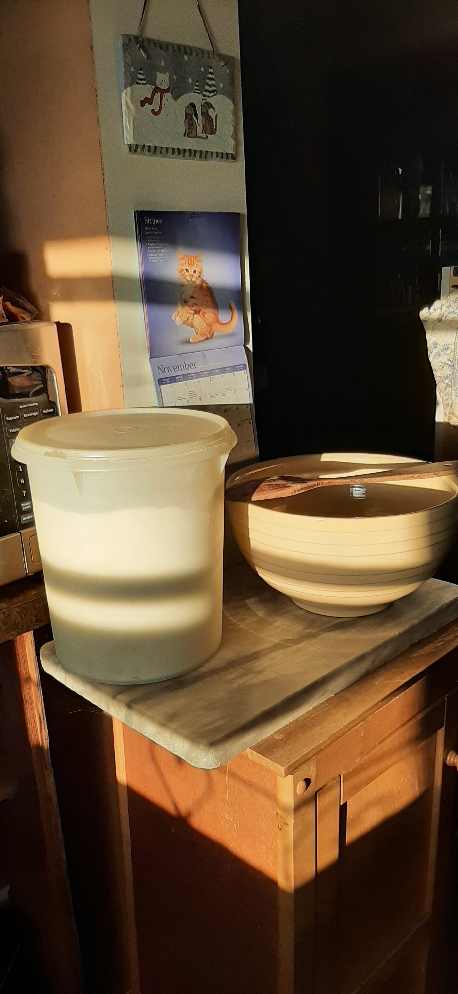 My “canister” for flour is immense: 11″ tall, 9+” in diameter, holds the 10lbs of flour I buy at a time throughout the year. 25lbs at Christmas time won’t fit all at once, but it doesn’t take long to get through it!! And my lovely bread bowl that only comes out for Christmas bread (I use my bread-mixer the rest of the year)